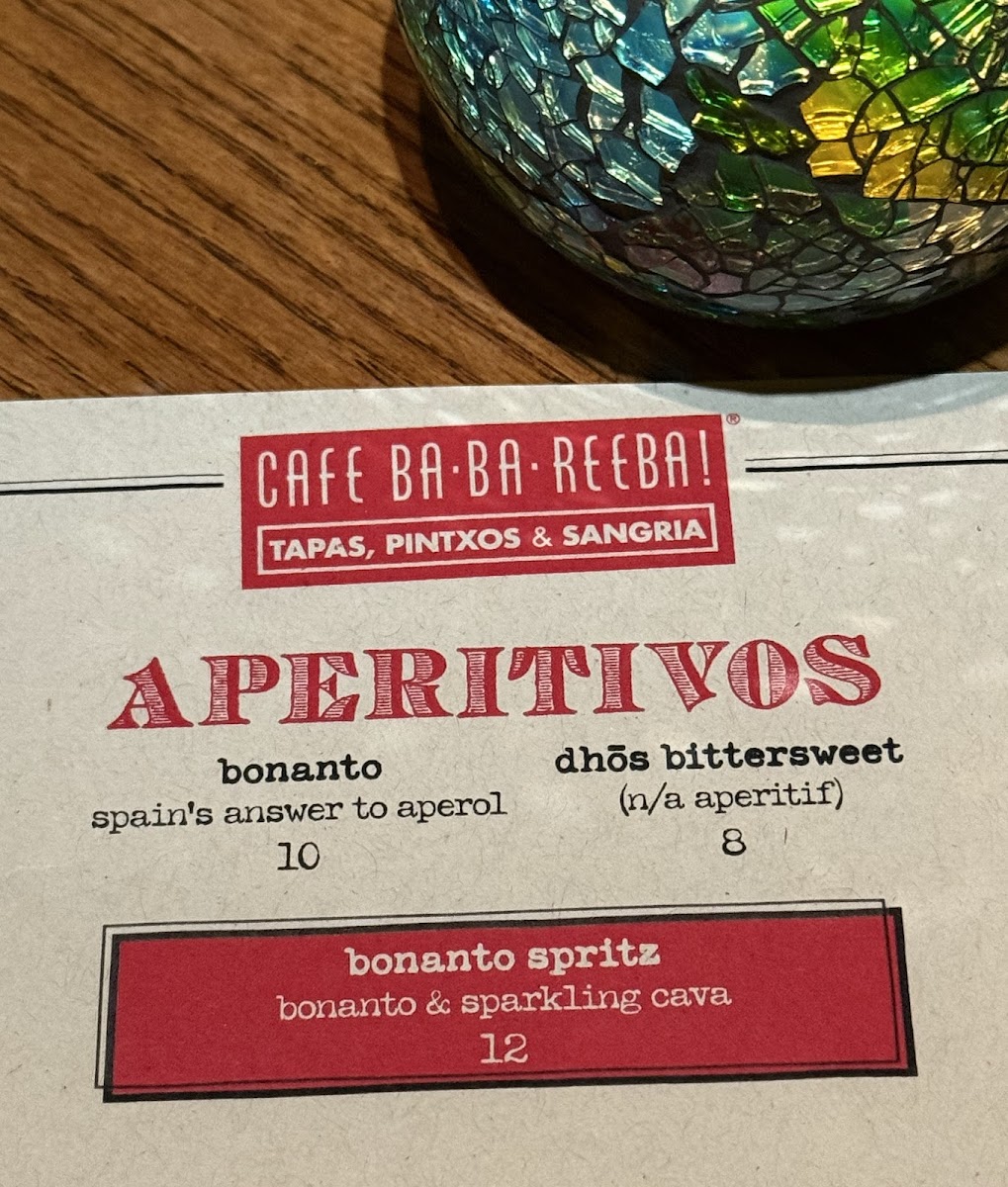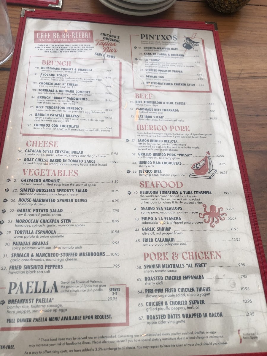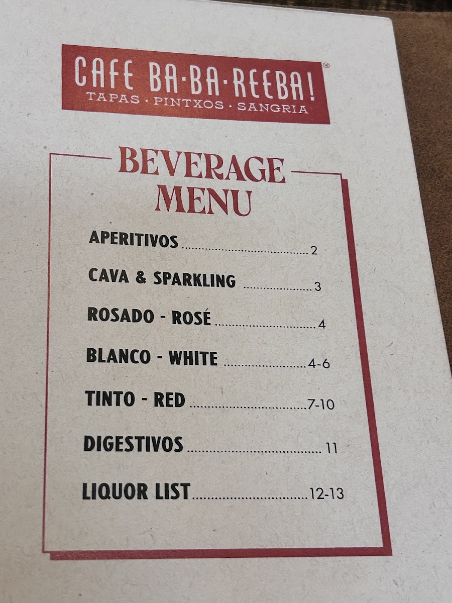 Drinks at Cafe Ba-Ba-Reeba! follow the laid-back yet spirited mood, featuring easygoing favorites like a sangria flight or a Saturday brunch Bloody Mary, ideal for gathering with friends or easing into the weekend. Whether indulging in a midday meal or enjoying evening tapas alongside refreshing sangrias and cava, the menu supports the vibrant yet relaxed energy that defines the dining experience here.